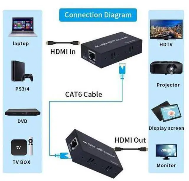 • 4K HDMI Extender 100M over Single Cat5E/6 Cable HDMI Ethernet Extender Transmit Extension Repeater with EDID for PC HDTV Laptop(with US Plug)