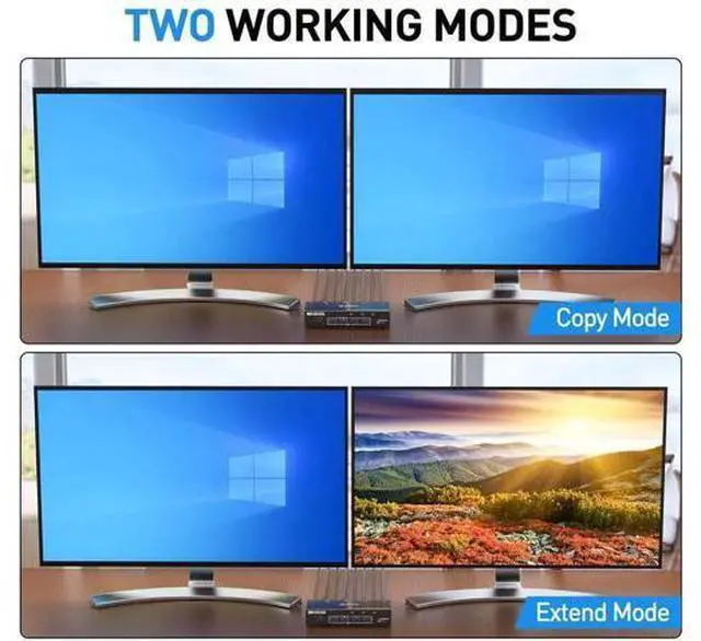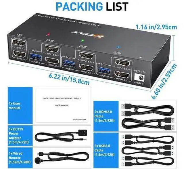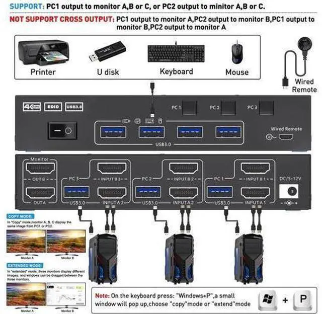 Note: Keyboard short cuts (hotkeys) switch way not supported. Two display modes KVM switch dual monitor hdmi support extend display mode or copy display mode, when in "mirror" mode the main screen can be copied to the second screen output two identical screen. When in "Extend" mode, the window from the main screen can be dragged to the second screen output two different screens. Accessories 2X HDMI cables ( 1.5 m) 3X USB 3.0 cables ( 1.5 m) 1X DC5V power adapter (US) 1X wired remote