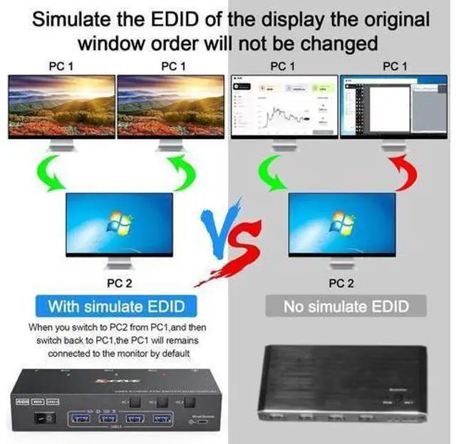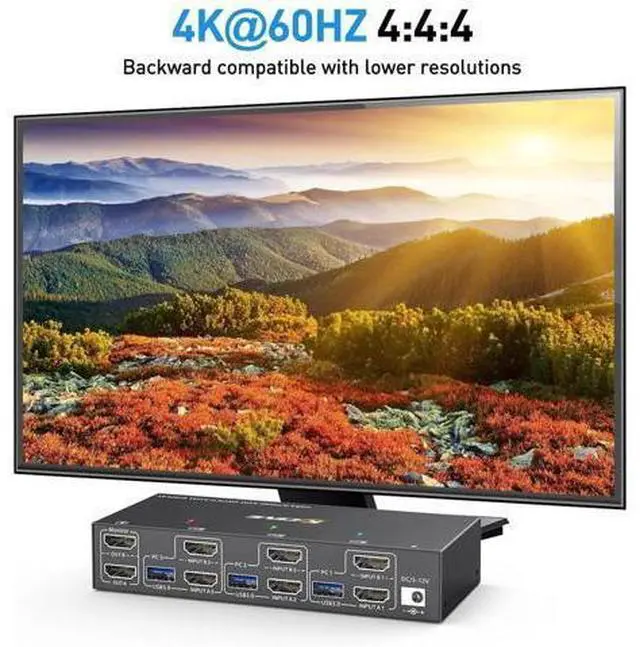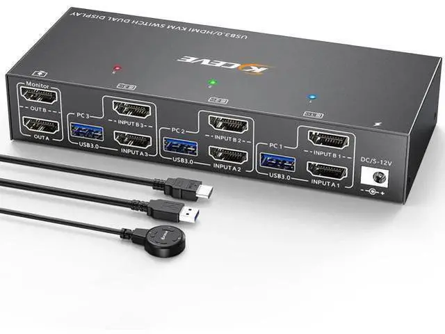 KVM Switch Dual Monitor 3 computers 2 monitors This 2 monitor KVM switch allow you to control 3 computers or laptops by only one set of wired or wireless keyboard mouse. It is widely applied for office, multimedia teaching, meeting room, etc. Ultra HD 4K@60Hz/2K@144Hz USB 3.0 Dual Monitor KVM switch HDMI support resolution @, @, @. 3 computers 2 monitors KVM switch aslo support input terminal to connect 2 computers with different resolutions, e. g. one is 4K@60Hz, the other is 4K@30Hz, 1440P@60Hz, 3D, 1080P@60Hz or lower resolution.