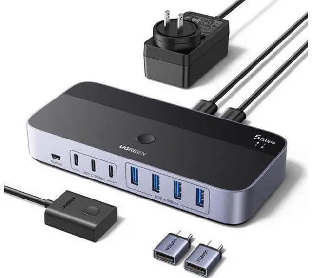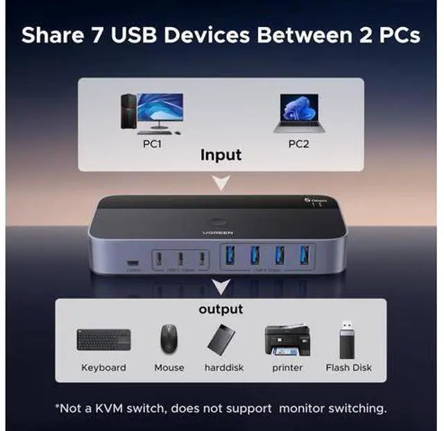 USB A switch: UGREEN USB Switcher allows 2 computers to share up to 7 USB devices (4×USB-A + 3×USB-C) Regardless of port type, easily connect your existing peripherals like keyboards, mice, printers, flash drives, and more. No need to buy extra USB hubs or docks save money and keep your workspace neat. (Not a KVM switch, no video output supported. ) 5Gbps Data Transfer /