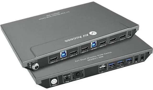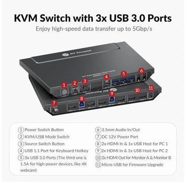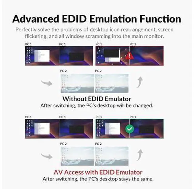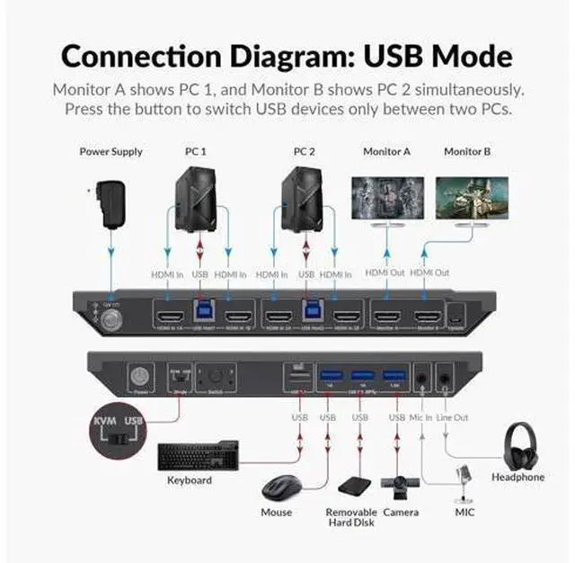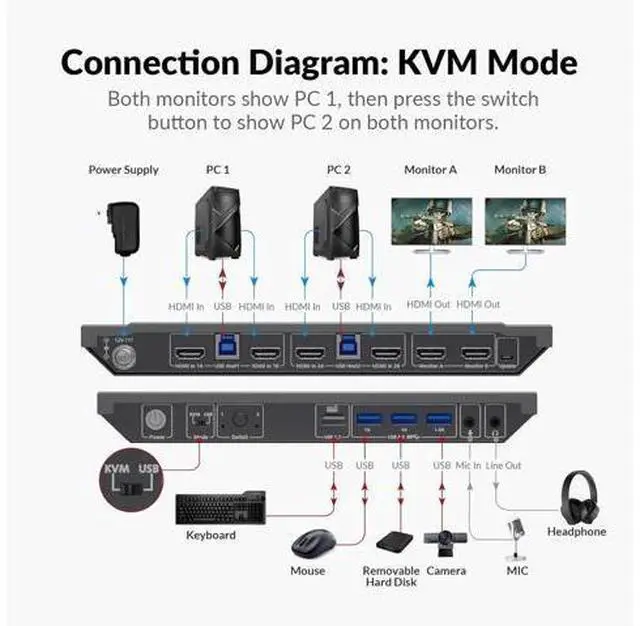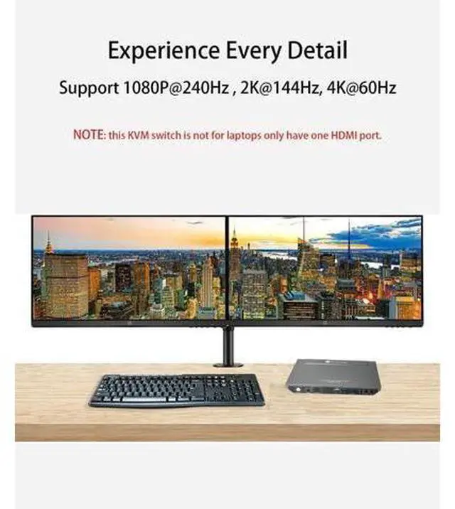 Computers: The integrated USB 3.0 ports allow you to share USB peripherals like printer, scanner, webcam and hard disk between 2 computers with data transfer rate up to 5Gbp/s (10 times faster than USB 2.0 ); Extra USB 1.1 port for Hotkey switching. High Refresh Rate up to 240Hz: Supports Dual Ultra-wide Screen, maximum resolution up to 4096x2160@60Hz, 2560x1440@60hz/144Hz, 1080P@240Hz and compatible downwards depending on support of graphic card, monitor and adapters if used any; Supports auto detection and memory function in case of power down; Also supports separate audio and microphone ports.: To get pictures on dual monitors, your host PC need to have two HDMI signals to the KVM switch. If your PC only have one HDMI signal, then you will get one picture only., B0C4TB6Y67, and B0BXSL127K &, B0CCHF4GWN. Two Switching Methods with