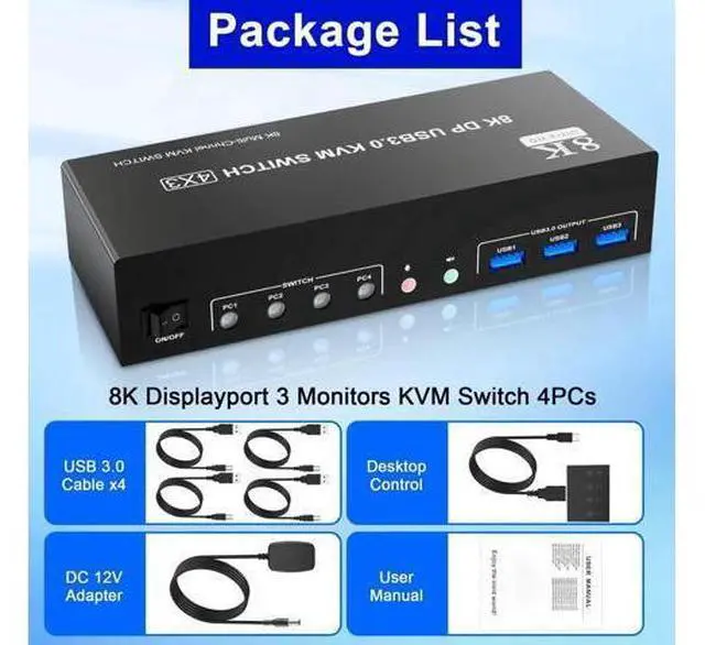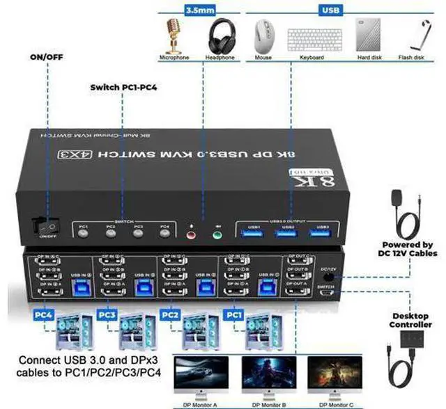 2 Switching modes: Button switch and wired remote. 5. KVM switch with 3 USB 3.0 ports for USB devices, and with extra Audio Microphone output 6. Plug and play, compatible with Windows, Linux, Mac, Unix, Ubuntu, Raspberry and most other major OS 7. The ports that need to plug in ayPort/USB cables are all hidden behind the triple monitor KVM switch, so the desktop doesn't get cluttered, you can enjoy the clean work space. Installation Guide Tips (incorrect connection will cause malfunction): 1. Insert the DC/12V adapter into the KVM; 2. Plug the 3*DisplayPort cable into the KVM switch and monitor; (Output) 3. Plug the 3*DisplayPort cable and 1*USB cable into the KVM switch and your computer/laptop (DP cables are not included) (Input) DP IN 1A + DP IN 1B + DP IN 1C + USB IN 1=PC1 DP IN 2A + DP IN 2B + DP IN 2C + USB IN 2=PC2 DP IN 3A + DP IN 3B + DP IN 3C + USB IN 3=PC3 DP IN 4A + DP IN 4B + DP IN 4C + USB IN 4=PC4 Please check whether DP IN 1A, DP IN 1B, DP IN 1C, and USB IN 1 corresponding, and whether DP IN 2A, DP IN 2B, DP IN 2C and USB IN 2 are corresponding. Mixed insertion is not supported. The same goes for PC3 and PC4. 4. Insert the mouse and keyboard into the KVM switch 5. If needed, you can connect a microphone and audio port Note 1. Most of the reasons why only one video output works is because of incorrect connection.