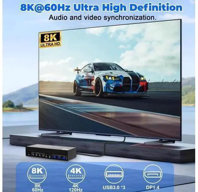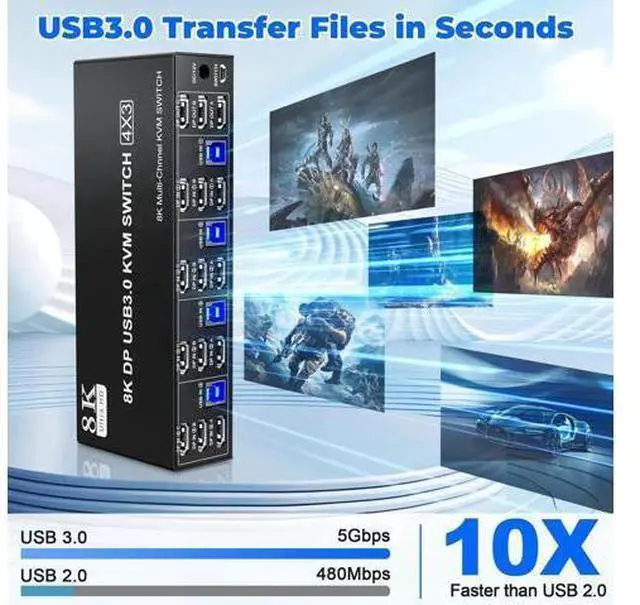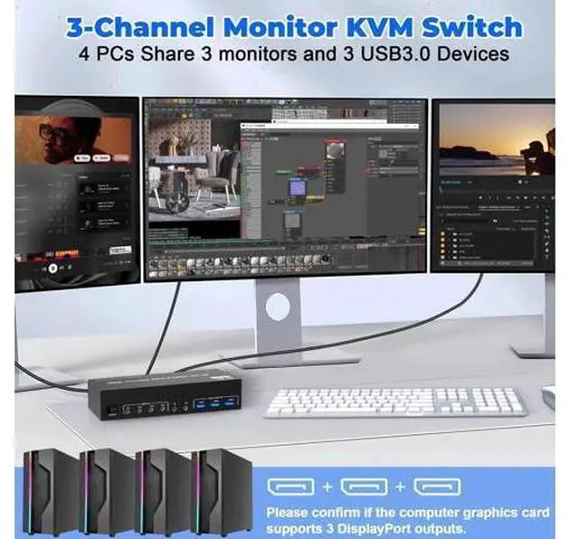 1. 8K Triple Monitor KVM Switch 4-Port allows 4 computers/laptops share one set of keyboard, mouse, and 3 monitors 2. This 3 monitor KVM switch 4 ports does not mean that it can only be connected to 4 computers. You may only have 2 computers now, but you may need to use 3 or 4 computers in the future, then you can choose this switch. Please make sure each of your PC has the ability to support triple display before purchasing. 3. Support DP 1.4 standard, backwards compatible with DP 1.2 standard.