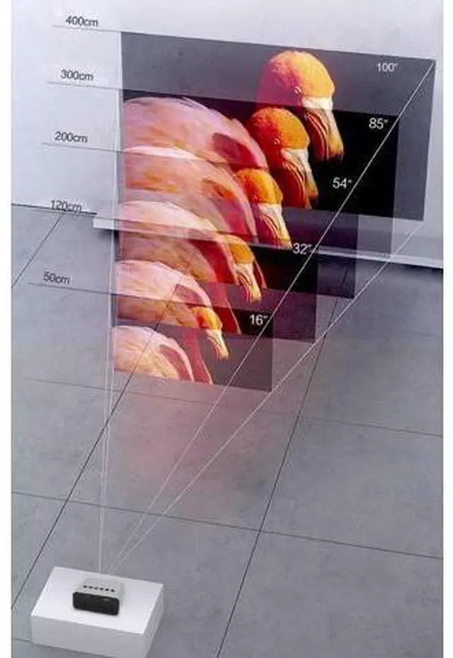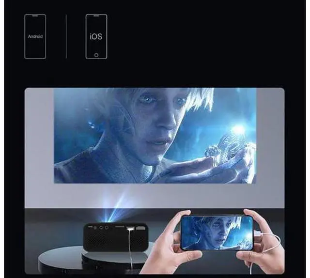: Based on an upgraded home theater projector, native 320*240 resolution, supporting 1080p full HD. The projector has 1000 lux brightness and 1000:1 contrast ratio, can display 16 to 100 inches, and the projection distance is within 50*300cm. All performance has been improved. Portable and