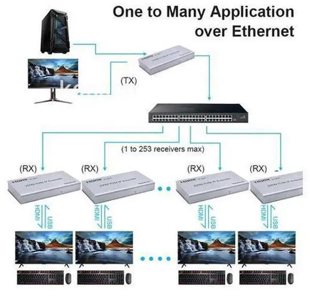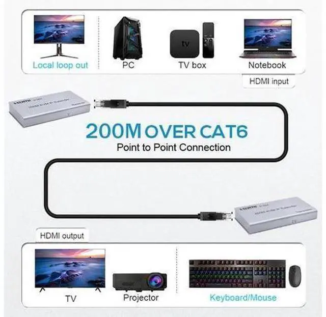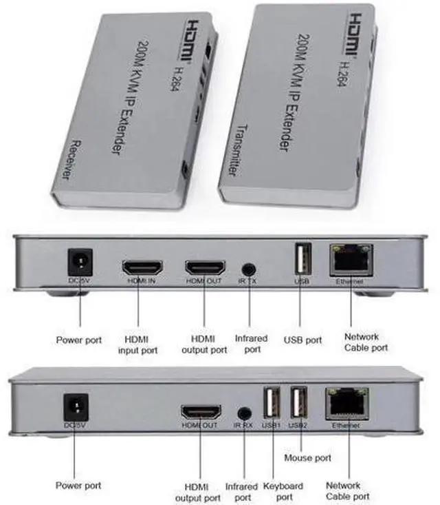 IR Control Introduction: HDMI 200M Extender over IPis based on TCP/IP standard. It transmits your HD display with the high resolution up to 200 meters away from your DVD or computer source by using one CAT5e/6 cable. At the same time, it'sconvenient to transmit HDMI audio and video source by point-to-point mode, one point-to-many mode and cascade connection mode.