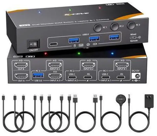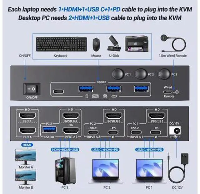 Please connect a DC 12V power supply for KVM Switch 3 PC 2 monitors. Each line of input signal corresponds to each line of display output. For PC1 and PC2, you need to connect USB C and HDMI cables to the KVM to display 2 screens. ^^ Great Compatibility and Wide ApplicationUSB 3.0 KVM Switch 3 Computers support HDMI and USB C input devices, such as Desktop, laptop, Apple TV, PS5, HDTV, Monitor, Projectors. KCEVE KVM switch 2 monitors HDMI compatible with Windows 7/8/10/11/XP/Vista, Mac OS, Linux and Chrome systems.