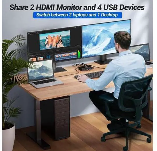 USB 3.0 HDMI 2.0 KVM Switch 2 Monitors 3 Computers USB CKCEVE KVM switch Dual Monitor allows you to control 2 Laptop and 1 Desktop with one set of mouse keyboard printer scanner and 2 HDMI monitors, supports webcams. The Desktop needs 2 HDMI + 1 USB cable to plug into the KVM Switch 2 monitor 2 laptop 1 desktop. Each Laptop needs 1 HDMI cable + 1 USB C cable to plug into the HDMI KVM Switch 2 Monitors. Please make sure your laptop's USB C port and HDMI can output video at the same time ^^ Dual Monitor KVM Switch 3 Computers with 4 USB 3.0 Ports up to 5GbpsKVM Switch Dual Monitor for 2 Laptop 1 Desktop Share 2 monitors and 4 USB 3.0 devices without unplugging, Securely Identify Keyboard, Mouse, printers, scanners and other USB devices.
