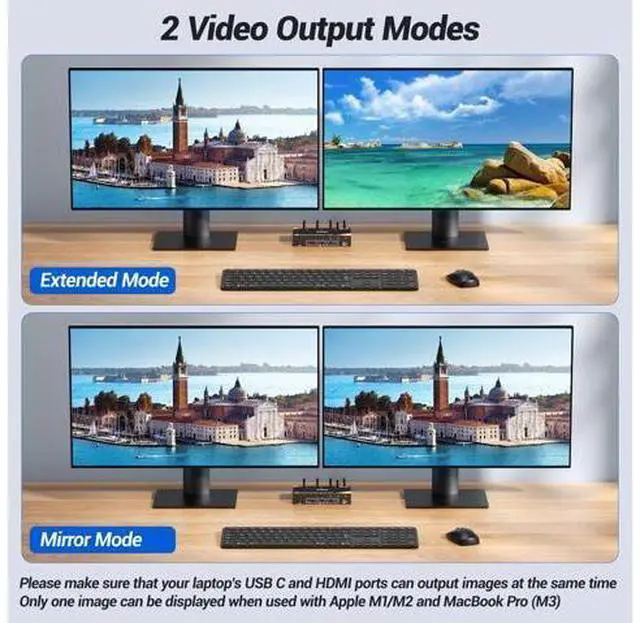 KVM switch 2 monitors 3 computers USB C support ultra-fast data transfer up to 5Gbps, backward compatible with USB 2.0 / 1.1 devices. Compliant with HDMI 2.0, HDCP 2.2 ^^ KVM Switch 3 Computers 2 Monitors Support Ultra HD 4K@60HzHDMI KVM switch 3 computers support 4K@60Hz, 4K@30Hz, 2K@144Hz, 1080P@144hz backward compatibility. You could pressWindows+Pto select mirror mode or extended screen mode. Apple M1/M2 only supports single-screen output. MacBook Pro (M3) cannot output images through both USB C and HDMI port at the same time, and can only output one image ^^ 85W PD for USB C KVM Switch 2 Laptop and 1 DesktopKVM 3 computers 2 monitors have the function of charging laptop.