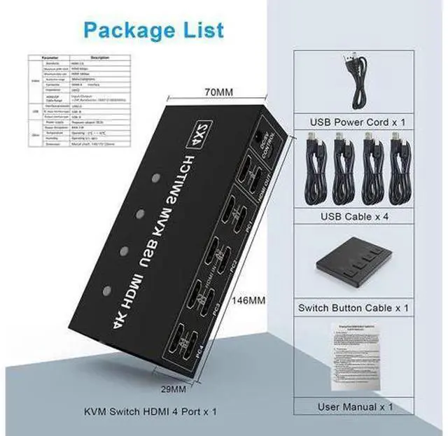 Package List: Dual Monitor KVM Switch HDMI x1 USB Cables x4 USB Power Cord x1 Wired Switching Button x1 User Manual x1 Remarks!: The above features is subject to the capability of your video card.