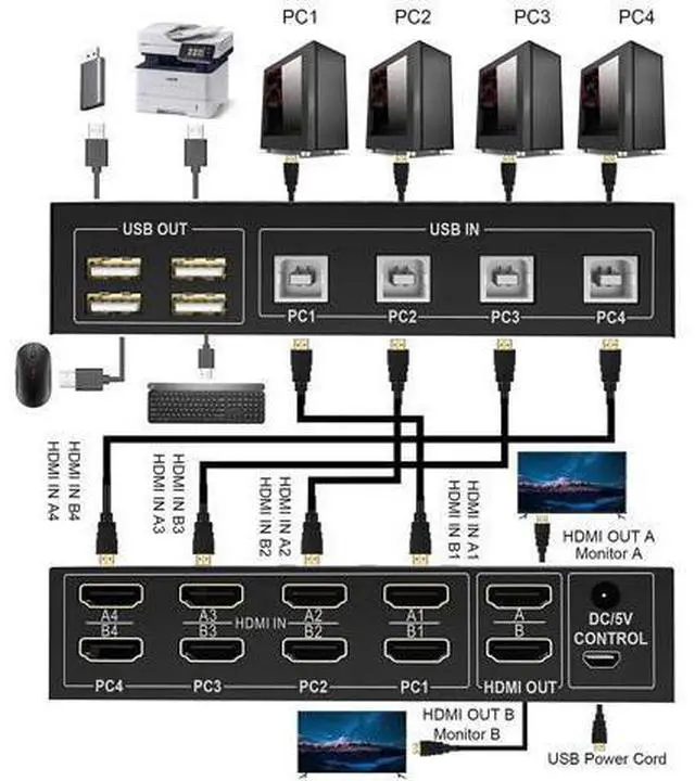 HDMI cables not included): Please check the HDMI IN A1 & A2 & A3 & A4, HDMI IN B1 & B2 & B3 & B4 and USB IN1 & IN2 & IN3 & IN4 is corresponding, HDMI OUT A, HDMI OUT B is corresponding, NOT support mixed insertion. HDMI IN A1 + HDMI IN B1 + USB IN1=PC1 HDMI IN A2 + HDMI IN B2 + USB IN2=PC2 HDMI IN A3 + HDMI IN B3 + USB IN3=PC3 HDMI IN A4 + HDMI IN B4 + USB IN4=PC4