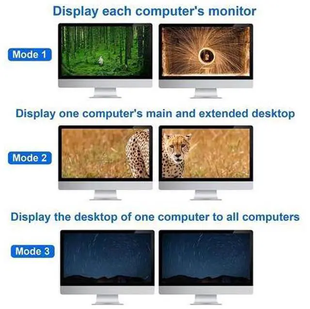 Product details: Dual Monitor KVM Switch HDMI 4 Port The KVM Switch 2 Monitors 4 Computers using only 1 set of keyboard, mouse and 2 monitors to control 2 computers, support display one computer's main and extended desktop. ( For dual monitor setups, it requires every computer support 2 screen or above display functions and must support extended display). Dual Monitor KVM Switch 3 Modes The Dual Monitor KVM Switch HDMI 4 Port with 3 display modes.