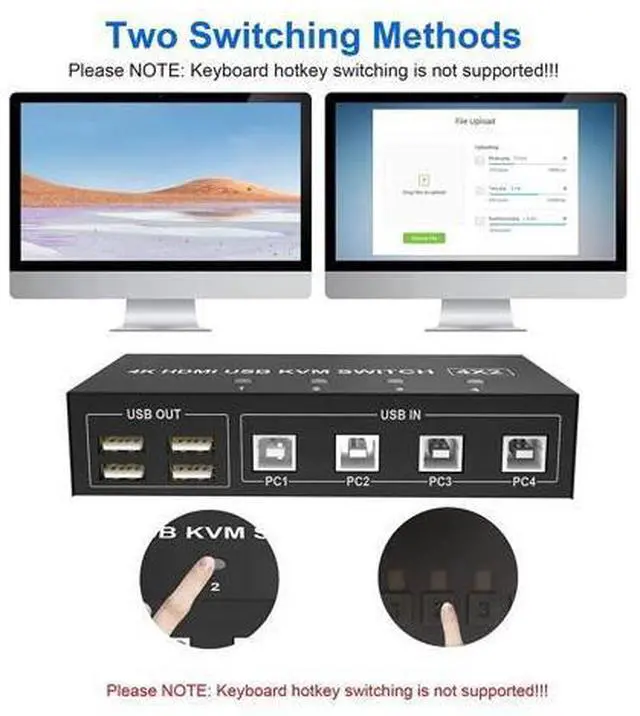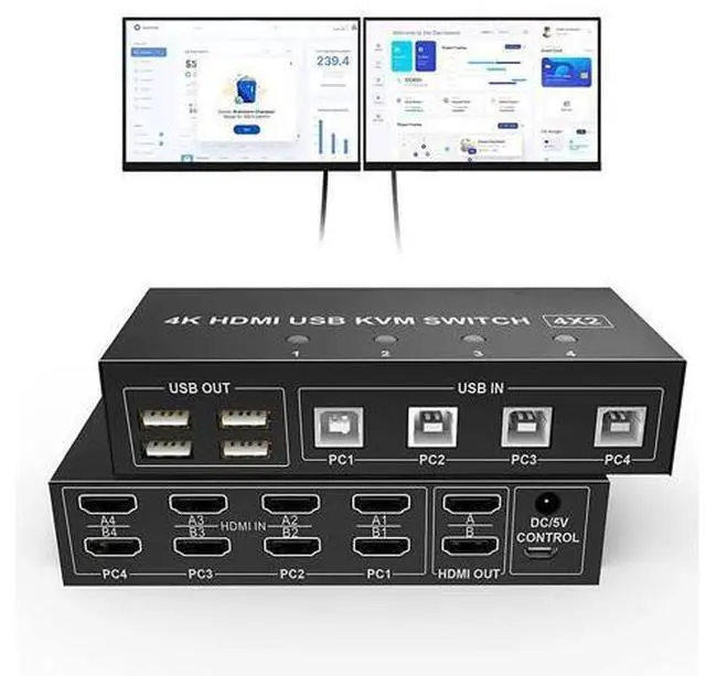 Dual Monitor 4 Port (HDMI + DHDMI ) KVM Switch 4K@60Hz This Dual Monitor KVM Switch HDMI 4 Port help you control 4 PCs share 2 monitors (Extend display mode or copy display mode) by only one set of USB keyboard & mouse.