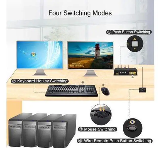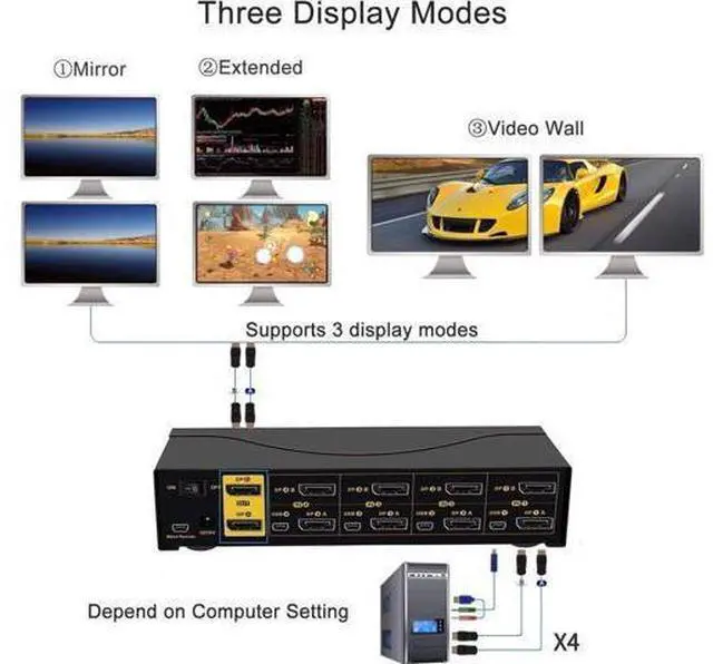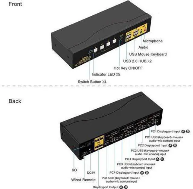 Special Notes: USB connecion is to ensure keyboard and mouse work properly. What if my computer or laptop only has one Display Port output? In this case, you will need reliable adapters or docking station for non-DP outputs. Please be aware of this before ordering! Some gaming, programing or michanical keyboard and mouse may not work well from the decicated USB keyboard and mouse ports, if so, connect them to standard USB 2.0 ports. or turn off the hotkey then the USB keyboard and mouse port will also become standard USB 2.0 HUB port This option does not support hotkeys. but you can use the wired remoter to switch between devices easily.
