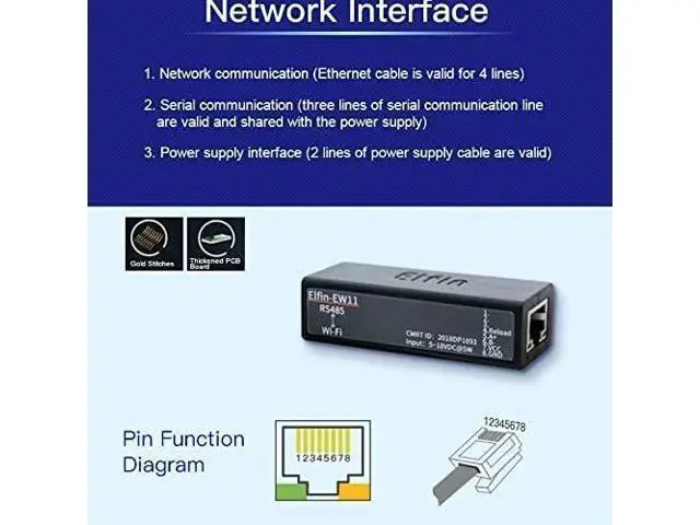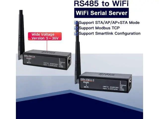• The Elfin-EW11A(-0) series support RS485 to WiFi, Elfin-EW11 unit is a complete solution for serial port device connecting to network. This powerful device supports a reliable and proven operating system stored in flash memory, an embedded web server, a full TCP/IP protocol stack,and standards-based (AES) encryption.