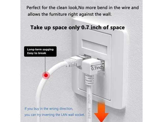 Universal Compatibility Right angle adapter overall length: 1.2 in, Ideal for LAN network devices such as PCs, computer servers, printers, routers, switch boxes, network media players, NAS, VoIP phones, PoE devices, and more. Please refer to the picture to select Correct ethernet 90 degree cable Perfect for the clean look, No more bend in the wire and allows the furniture right against the wall. If you buy in the wrong direction, you can try inverting the RJ45 LAN wall socket.