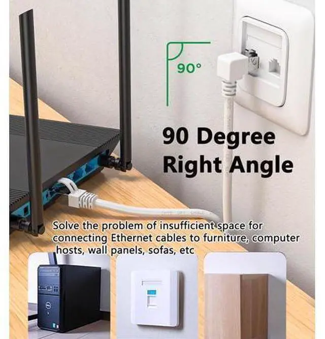 90 Degree Right Angle Ethernet Adapter Can be better used in narrow spaces, tight fit your laptop or connect to network wall plate behind furniture, prevent the lan cable from bending,. White ethernet patch cable can be completely hidden of the white wall without being easily detected. High Performance Well constructed with metal connectors, Flexible PVC jacket, 26 AWG pure copper conductor, to ensure the stability of transmission. Backward compatible with Cat5e, Cat5 cable network, comply with UL specifications for Cat 6 ethernet cables. Upload & Download Speed Support bandwidth up to 250MHz & Transmitting data at speeds of up to 1Gbps for your low latency browsing the Internet, online games, online games, stream videos, music, and more.