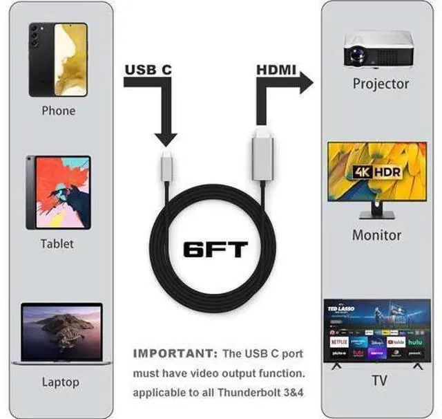 usb c to hdmi cable 6ft can transfer video from a laptop or smartphone to a monitor tv or projector for multi-screen displayusbc hdmi cable 6ft is made with HDMI 2.1 standard compatible with HDMI 2.0 HDMI 1.4 resolution up to 1080P 60hz 2k 60hz 4k 30hzusb type c port (thunderbolt 3 & thunderbolt 4) to connect to phone tablet laptop such as macbook pro 2021/2020/2019/2018 macbook air/ipad pro 2018 chromeBook Surface Book Galaxy S21/S20/S10/ S9 etc. the hdmi male connector is connected to hdtv monitors projectors and realizes multi-monitor display extended display and mirror display. plug and play hdmi to usb c cable no need to install drivers or software easy to use for home or office work or entertainment.