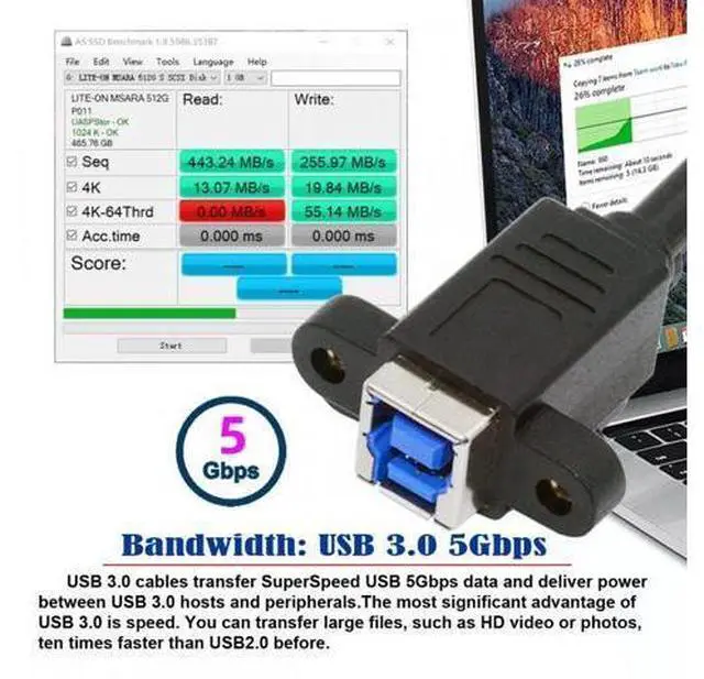 USB 3.0 Type-B Female to USB 3.0 Type-C Male Cable Extension 5Gbps for Disk SSD Camera Data 30cm Offers a throughput of up to 5Gbps when used with a USB 3.0 host and device, an 10x the capability of USB 2.0.