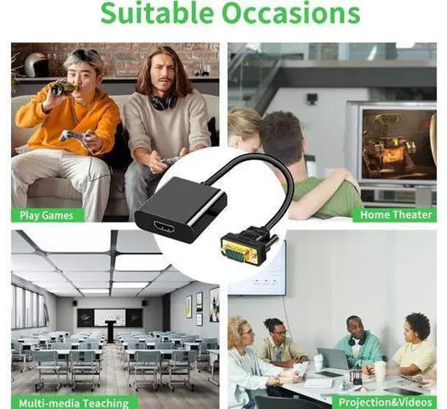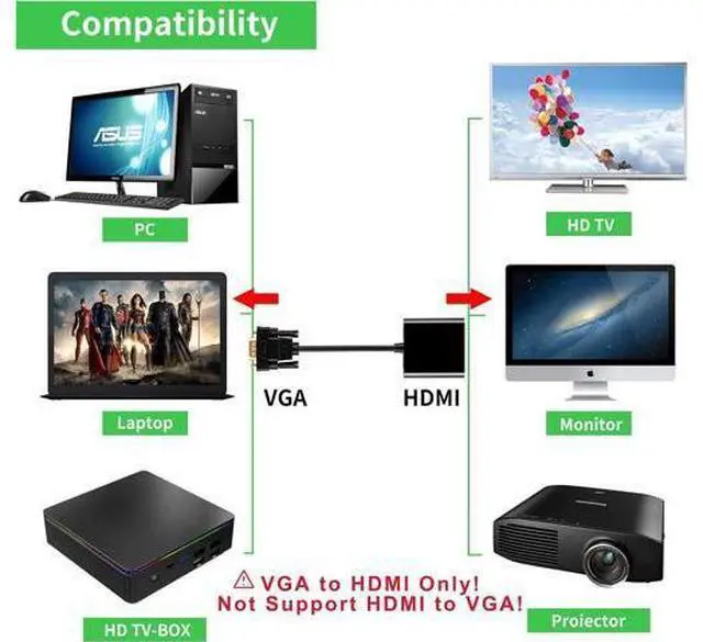 IMPORTANT NOTE: This adapter CAN NOT be used as a HDMI-to-VGA converter. Please know that the product is not defective! It's just only work for VGA to HDMI!!! Please be aware before ordering!!! Portable VGA-to-HDMI Adapter/Converter easily hook up old computer/laptop with VGA output to new TV monitor or projector with HDMI input for video streaming game playing screen mirroring or extending. VGA output/HDMI input supports support video and audio synchronously video resolution up to 1920x1080@60Hz (1080P full HD) transmit stereo sound of the video via the 3.5 mm aux jack. Plug and Play but the micro USB port MUST be connected to get power for the build-in active VGA-HDMI chipset (not working at all if not connected). Compatible with Windows 7/8/10/11 Linux OS operating system. Package included a 15 pin D-sub (VGA) to HDMI adapter a 3.5 mm jack Audio Cable and Micro USB Power Cable. If the product you received did not work or suddenly stop working please contact us immediately via Message to get refund or replacement! Herfair offers 30 days free return and 18 months warranty to all our products!