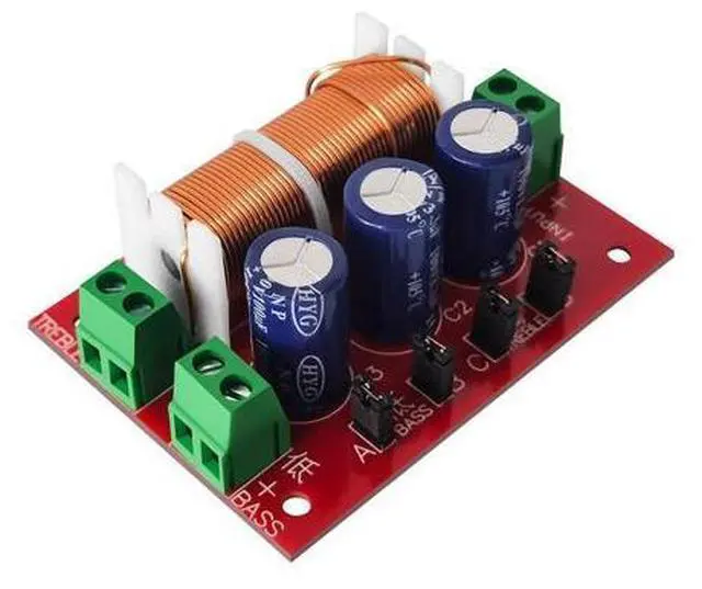 High-Quality Components: The frequency divider features pure copper jumpers with ABCD four positions and comes with four plug caps. It uses high-quality copper wire inductors, capacitors, and sockets, and a fiberglass circuit board. The high-frequency settings include weak/medium/strong, while the low-frequency settings include full sound/low sound/strong bass/medium sound.