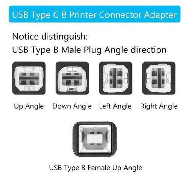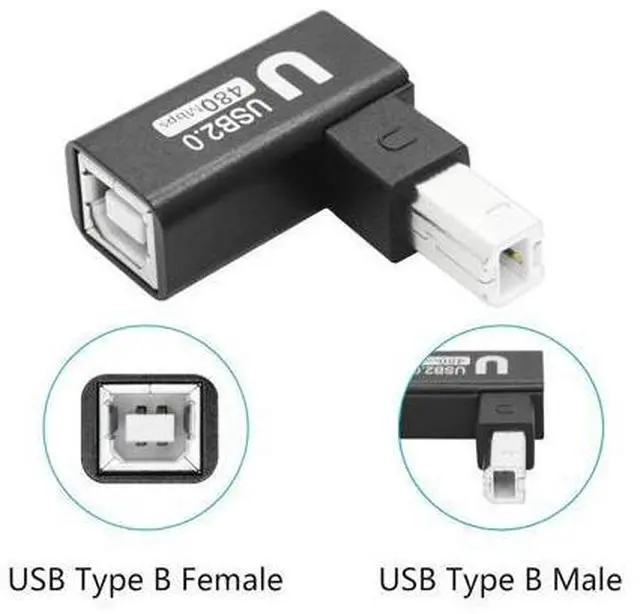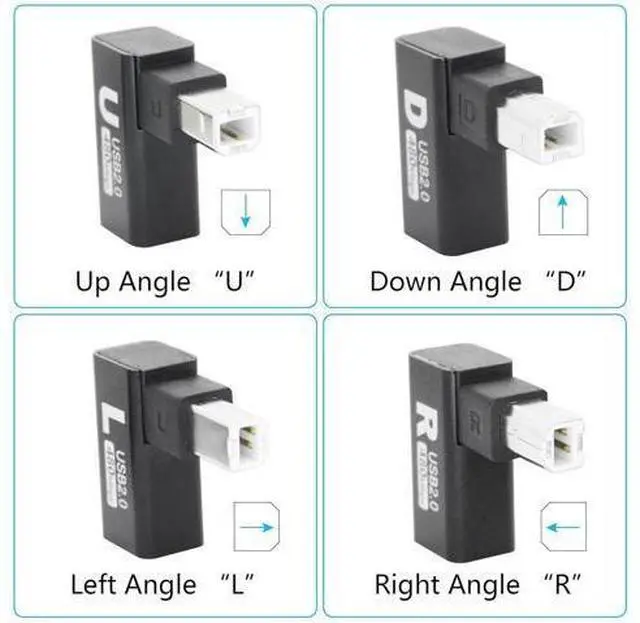 Please NoteThe direction we define may be different from what you understand choose the appropriate angle for your device based on the narrow side of the USB Type B Connector (Plug) As Left Angle Right Angle Up Angle or Down Angle. Right Angle DesignThis 90 degree printer adapter allows the cable to have a suitable extension direction which can avoid the wear of the cable and the input port of the device solve limited connectivity between devices prolong the service life. High Speed TransferUSB Type B 2.0 male to female extender connector support 480Mbps data transfer backward compatibility with USB 1.1 and low speed USB 1.0 this adapter offers you a better and more efficient way of working.