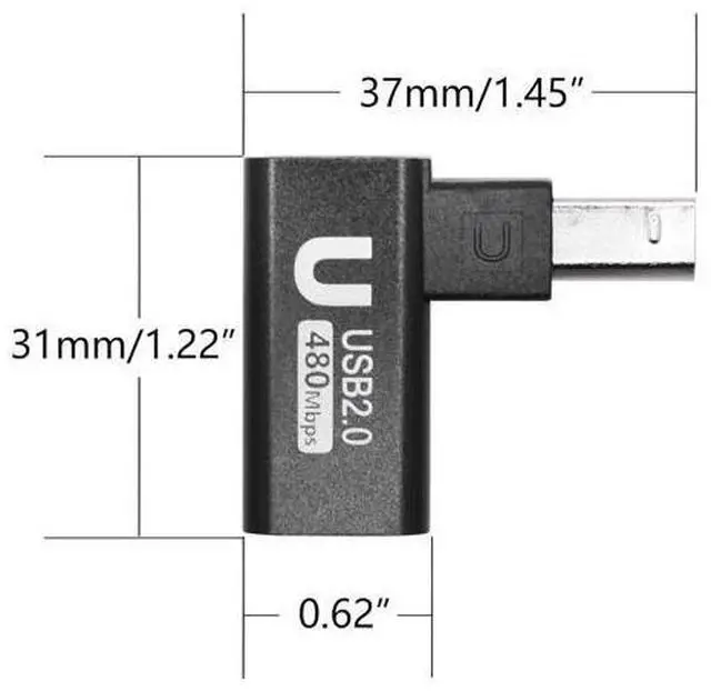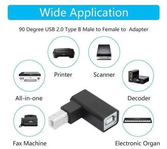 Durable and Portable90 Degree USB B 2.0 Printer adapter the shell is made of aluminum alloy featuring heat dissipation wear resistance and other characteristics. Small size light weight it is convenient to carry. Widely CompatibleUSB B 2.0 printer adapter widely for Printers s Fax machine or with MIDI port electronic musical instruments such as Electric pianos Keyboards Drums and Mixers.