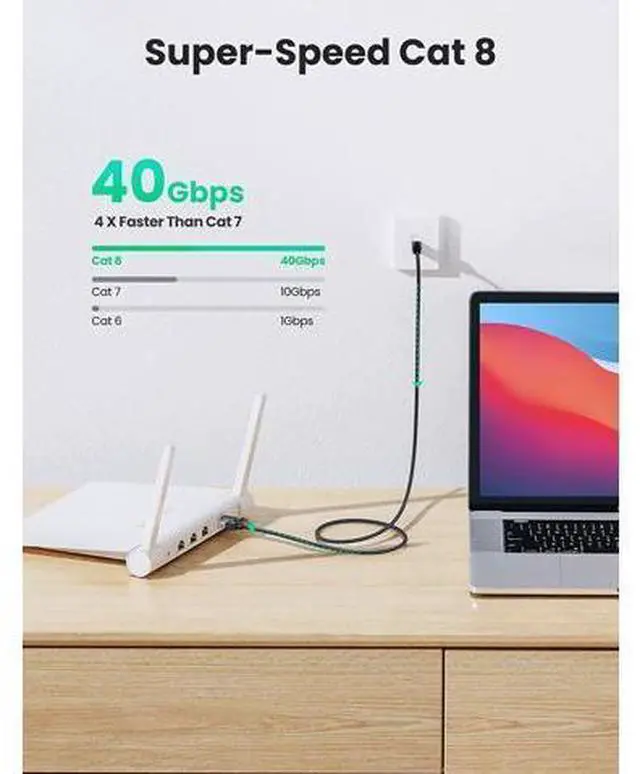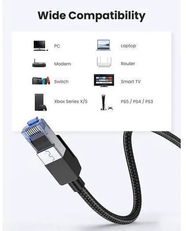 Wide Compatibility: With the RJ45 Connector, UGREEN Gigabit Cat 8 ethernet cable can be perfectly compatible with computers, laptops, modems, routers, PS5, PS4, PS3, X-Box 360, X-Box One, Switch, networking switches, ADSL, network adapters, hubs, and other networking devices. It can also be fully backward compatible with Cat7, Cat6e, Cat6, Cat5e, Cat5.