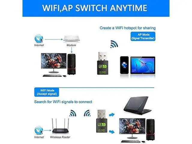 Bluetooth: Only for windows 7/8/ 8.1 /10, not compatible with Vista/xp/Mac OS. (The blue LED light will flash when works. ) 2.4G hz/ 5.8G hz DUAL BAND WIFIBuilt-in Chip RTL8821CU, lasted IEEE 802.11 a/b/g/n/ac universal wireless network technology. Offers speed up to 5.8GH z (433Mbps) and 2.4GH z (150Mbps), 5.8GH z is perfect for HD video streaming and lag-free online gaming, 2.4GH z Wi-Fi for normal use such as web surfing, music, chat online etc. SUPPORT AP MODEWiFi transmitter for networked computers, set to AP launch mode, the computer's wired network can be converted to WiFi signals, so that mobile phones, tablets, laptops can be wirelessly connect to WiFi Internet. BLUETOOTH TRANSMITTERBluetooth 4.2 enables your non-bluetooth PC to wirelessly connect with Bluetooth devices(such as smart phone, ipad, tablet, speaker, headset, keyboard, mouse, printer, projector, etc. ) for data transfer, edit or print, up to 33ft connection distance. (ONLY COMPATIBLE WITH WINDOWS 7/8/ 8.1 /10)