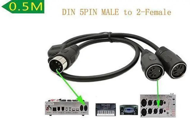 adapter 1: DIN 5PIN male to 2- female, 1 x MIDI DIN 5 Pin Male audio singal to Dual 2 x MIDI DIN 5 Pin Female audio singal. 2. High grade PVC cable jacket and over mold for excellent strain relief 3. Compatible Devices - This MIDI DIN Splitter Cable work for MIDI Keyboard, Synthesizer, Organ, Electric Piano, Guitar and Others. 4. Cable Length - 0.5M / 1.5 feet, Y cable 5.