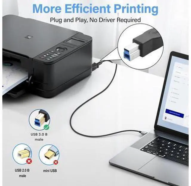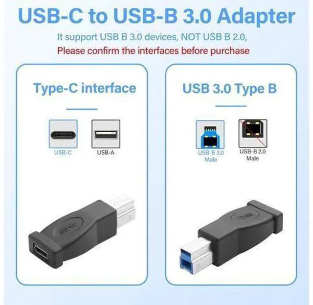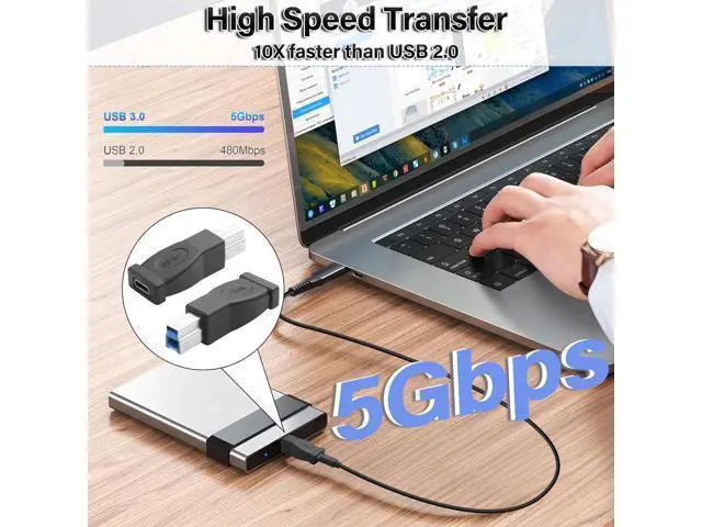 USB C to USB B 3.0 Adapter Easily expand your laptop's storage space by connecting a portable USB 3.0 hard disk and quickly read videos/photos/files from the hard disk. If you want the fastest transfer speeds between your computer/ Laptop and external device please Use this Adapter. Data Transfer 5Gbps It unlocks lightning speeds of up to 5 Gbps allows you to transfer the largest files from HD videos to massive photo libraries offers fast 5V 2A charging and is fully compatible with USB 3.0 type b port devicesWide