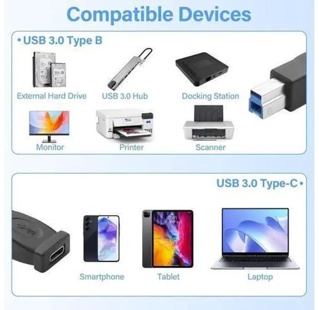 Compatibility: USB C Female to B 3.0 Male Adapter Connect a PC laptop tablet or smartphone with USB Type C port (OTG support required) to an external hard drive with USB Type 3.0B port digital camera printer s USB docking stations displays USB 3.0 hubs and more devices with USB 3.0B ports. Easy to UseSmall and delicate easy to carry plug and play. Simply connect the USB-C device to your USB B device without complicated installation or setup and its ends fit tightly to provide a strong connection between a portable external hard drive and your laptop.