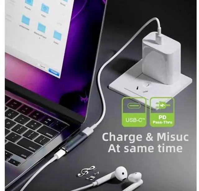 1pc adapter in the package. USB-C Type-C to 3.5 mm Audio DAC AUX Music 100W PD Power Adapter for Laptop Tablet Phone The 3.5 mm audio and power can work at same time. You can transfer audio data and charge the laptop/tablet/phone simultaneously. The angled type Allowing you to connect it to a female port, even if space around the port is limited. Reversible Design for Type C connector, Reversible plug orientation Cable direction. USB-C Sound Card Adapter Enable USB connectivity with your existing 3.5 mm audio headphones, headset, speakers, or microphone.