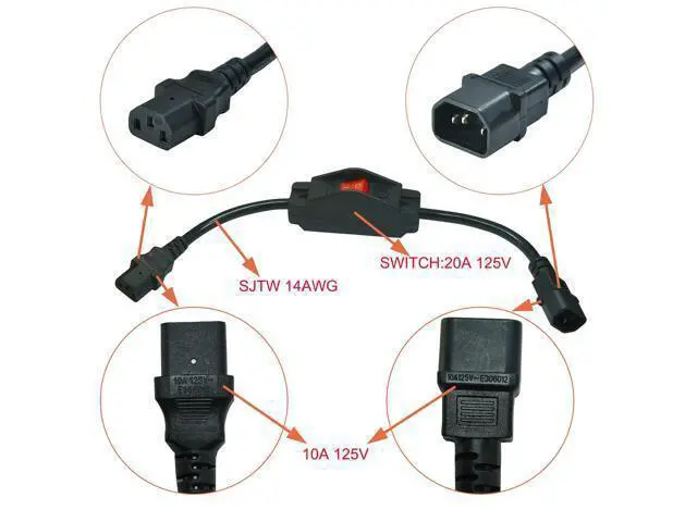 Adapter Cable: Which comes with a switch that allows for easier circuit control. Convert your C14 power cord to 3 Pole IEC 320 C13 female port without extra cable UL SJTW 3/C 14AWG 42CM length Cord rated @ 10A 125V Black Color Connectors 1 (IEC 320 C14) IEC 3Pole male power jack Cord switch DPST Rocker switch 20A 125V AC with red led Connectors 2 IEC-320-C13) female IEC 3 Pole with switch power quick connect disconnect jack. Black 3 Prong Extension Cord with Waterproof Switch, 14AWG Heavy Duty Short Ex... Flat Plug Extension Cord with ON Off Waterproof Switch, 16AWG Right-Angle NEMA... FILSHU 3-Prong Extension Cord, 1625w Heavy Duty Short Extension Cable with On... White Angled Plug Heavy Duty On/Off Switch Extension Cord, 16-AWG Household Pl... FILSHU PDU UPS Male to Female Power Extension Cord Cable, 10A125VAC IEC320 C14... Customer Reviews Price no data cable length 1.3FT 1.3FT 1.3FT 1.3FT 1.3FT Switch Rating 30A 10A 30A 10A 10A voltage 125 volts 125 volts 125 volts 125 volts 125 volts is ul listed????? gauge 14 16 14 16 18 input current 15A 10A 15A 10A 10A Specification IEC 320 C14 to C13 Extension cord with on-off switch 42CM length UL SJTW 3/C 14AWG( 2.08 mm2) Cord rated @ 10A 125V