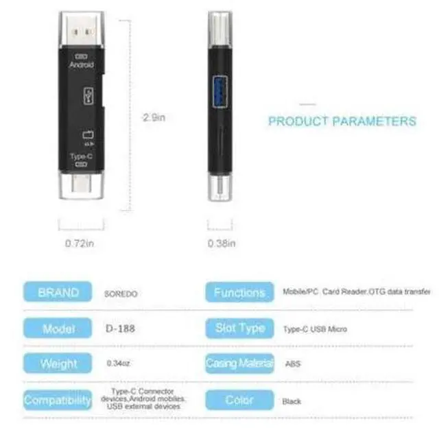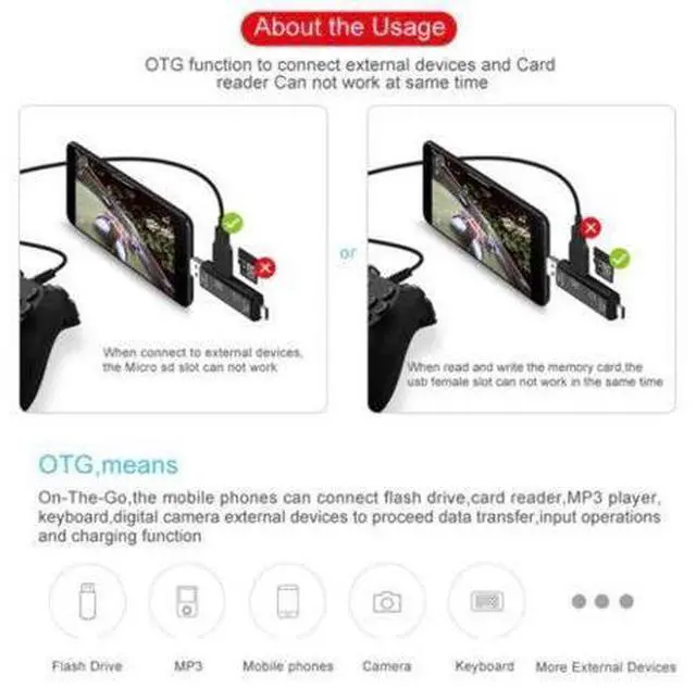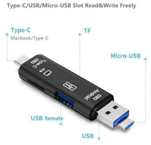 Interfaces: Micro, 2.0 and Type C connectors. 1 x port slot, 1 x TF slot; Support memory card with FAT32 file system. Not compatible with NTFS & exFAT formats; Compatible with Micro and Type-C Andriod mobile deceives with OTG function; Compatible with Type-C interface laptop; Compatible with Windows; Compatible with Type-C laptop; Compatible with smart phone through OTG; Support OTG with MicroMobile Devices; The interface supports flash disk, mouse, keyboard and so on.