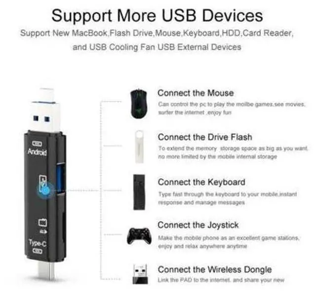 3.1 Card Reader High Speed SD TF Micro SD Card Reader Type C C Micro Memory OTG Card Reader for Laptop Computer Multifunction -C / OTG Card Reader The card reader function corresponds to Micro SDHC. The interface supports flash disk, mouse, keyboard and so on. Transfer files from TF card to your PC, Android cell phone, Android tablet, and C supported laptops, cell phones, tablets. Connect TF card to your devices (with OTG function) directly! Adding an extra memory card to storage more movies, pictures, music and enjoy them conveniently.