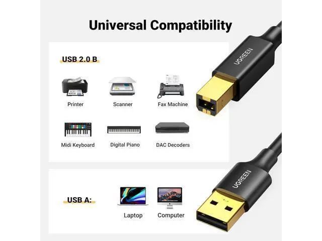 Ideal Printer Scanner Cable: UGREEN USB 2.0 printer cable is ideal for connecting your scanner, printer, server, hard drive, camera, piano, and other USB b devices to a laptop, computer (Mac/PC), or other USB-enabled devices for data transfer.