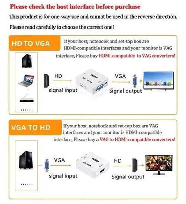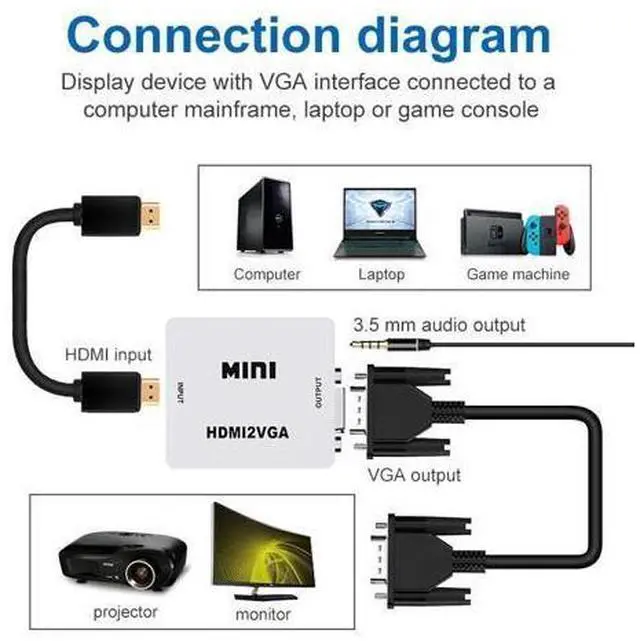 Supported input resolutions (at 60Hz): 640x480, 800x600, 1024x768, 1280x720, 1600x1200, 1920x1080 pixels Package include 1 x VGA to HDMI-compatible converter 1 x Mini USB power cable