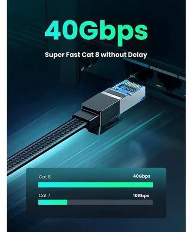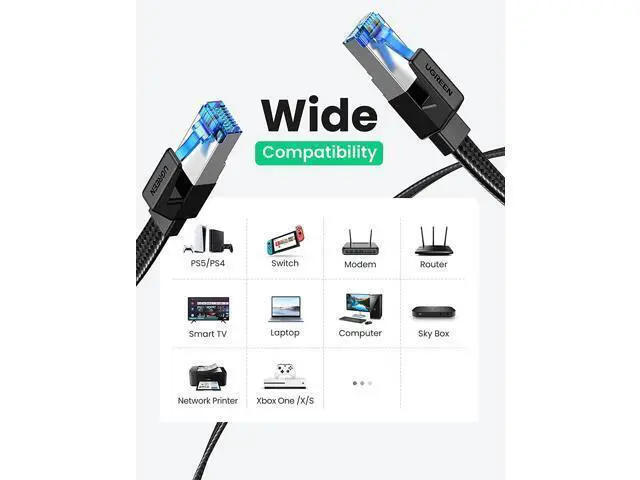 Wide Compatibility: With the RJ45 Connector, UGREEN Gigabit Cat 8 ethernet cable can be perfectly compatible with computers, laptops, modems, routers, PS5, PS4, PS3, X-Box 360, X-Box One, Switch, networking switches, ADSL, network adapters, hubs, and other networking devices. It can also be fully backward compatible with Cat7, Cat6e, Cat6, Cat5e, Cat5.