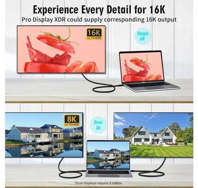 Monitors: The cable can support a single 16K@60Hz or dual 8K@60Hz monitor with higher resolution and refresh rate, which can display more detailed and realistic images. It can also be realized to support two 4K@60Hz monitors at the same time, which can improve work efficiency and visual experience.