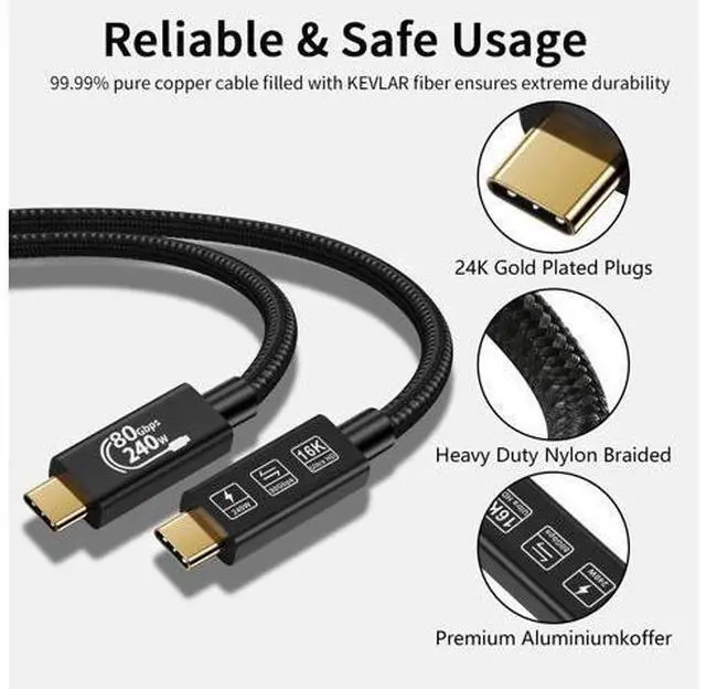 The USB 4.0 cable compatibility: TB5 gen4 cable has strong compatibility. USB C to USB C cable is compatible with Thunderbolt 5/Thunderbolt 4/Thunderbolt 3/Type-C devices and backward compatible with USB 3.2 / 3.1 / 3.0 / 2.0 devices. USB 4.0 also supports USB C DisplayPort Alt Mode and other standards. It supports i-Phone 15 Pro/Max, MacBook Pro, M1, M2, M3, SSDs, Type-C laptops, monitors, hubs, docks and eGPU devices. 24K Gold-Plated Connector This type c USB 4 gen4 Cable connector is 24K gold-Plated, High-quality aluminum alloy case on both connectors with molded strain relief ensures its reliable performance and longer bend lifespan. Plug into all your USB Type-C compatible devices without worry about the orientation of the port Exquisite Products and Lifetime Customer Support18 Months Worry free Product warranty and Lifetime technical support, and 24/7 email for Customer Service Support.