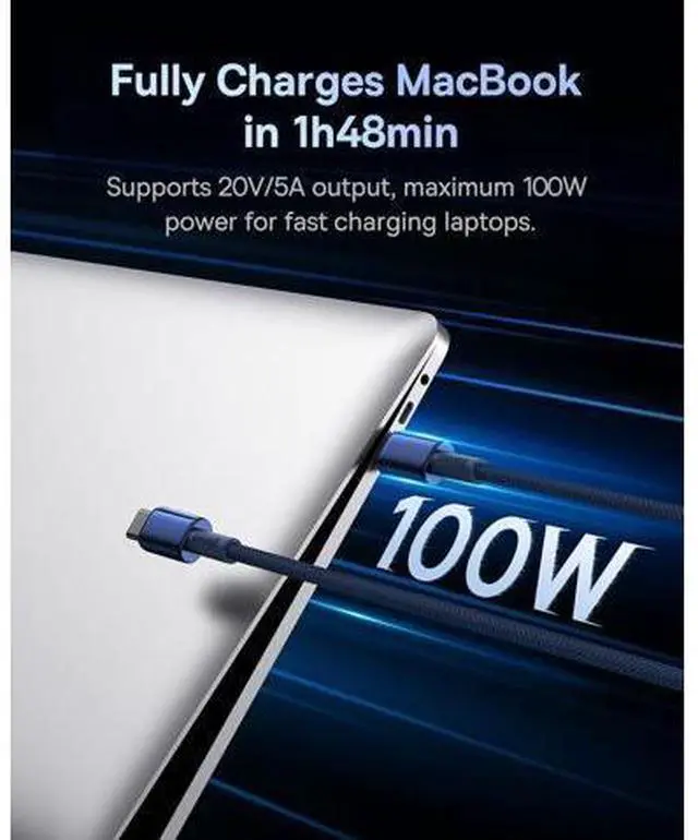 100W High Power DeliveryThe 5A/20V 100W PD technology takes the charging speed to the next level. The fast charge can fully charge a Galaxy S20, from 0 to 100%, in 50 minutes. It can also charge a MacBook Pro 16" up to 75% in 1 hour - 58% faster than a 60W cable. Certified E-Marker ChipThe certified smart chip regulates the current and voltage, ensuring the safest 100W fast charge. You can use it to charge any device with confidence. Build to LastPremium Zinc alloy material, with smooth UV coating and integrated design, makes this cable oxidation resistant and colorfast.