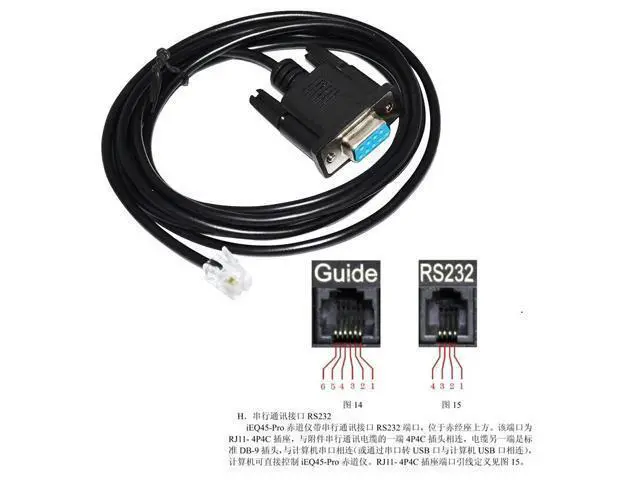 DB9 RS232 TO RJ9 RJ10 RJ11 4P4C EQUATORIAL MOUNT UPGRADE CONTROL CABLE FOR IOPTRON TELESCOPE CONSOLE KABLE IEQ30 PRO IEQ45 PRO ZEQ25 The iEQ45-Pro equatorial mount has a serial communication interface RS232 port, located above the right ascension mount. This port is an RJ11-4P4C socket, which is connected to the 4P4C plug at one end of the serial communication cable, and the other end of the cable is a standard DB9 plug, which is connected to the computer serial port (Or connect to the computer USB port through the serial port to the USB port), the computer can directly control the iEQ45-Pro equatorial mount.