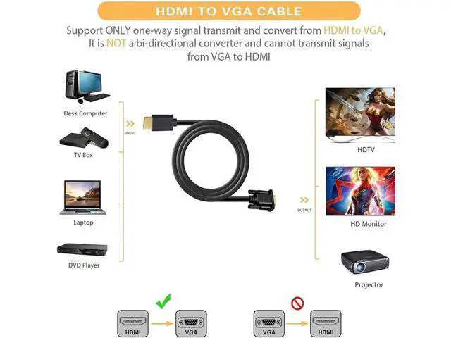 1) Uni-directional, Not Bidirectional This cable is used to connect the HDMI source to the VGA Display, it could not work in the opposite direction. For the VGA source to HDMI Monitor solution, please see the table in the following. 2) Not Compatible with low voltage HDMI Devices NOT compatible with Blu-ray, PS4, Apple MacBook Pro with Retina Display, Mac mini, and Apple TV. Those devices are low voltage HDMI source, could not provide enough power for chipset through HDMI slot. Another solution, HDMI to VGA with external power input is required.