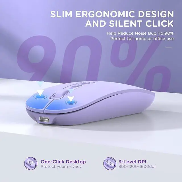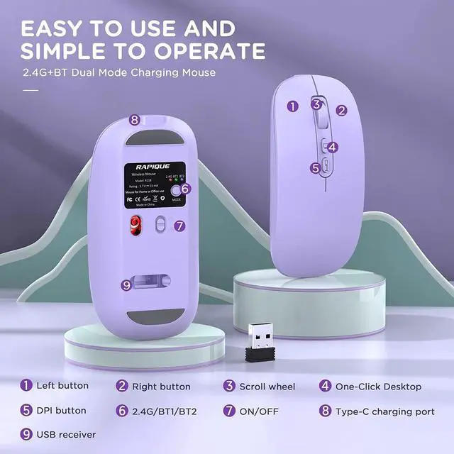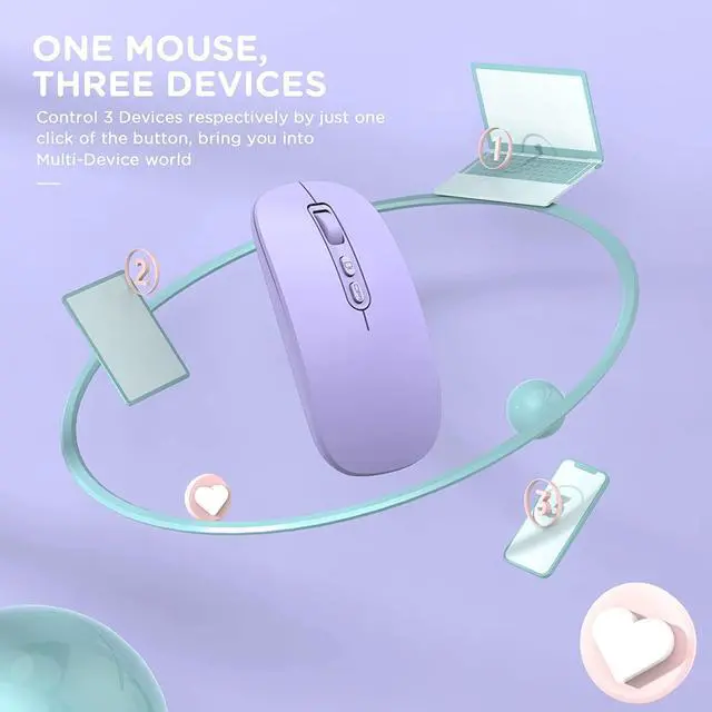 RAPIQUE Bluetooth Wireless Mouse, Rechargeable Multi-Device(Tri-Mode: BT1/BT2+2.4G) Computer Mice with USB Receiver, Slim Silent Mouse for Laptop/MacBook/Chromebook/Surface Pro/iPad Pro(Purple)