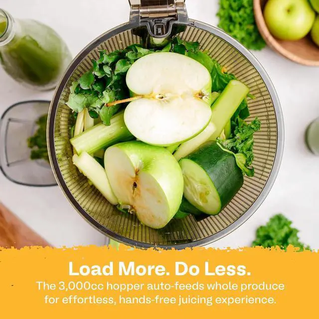 Hands-Free Juicing: Forget tedious pre-chopping! Load entire fruits and vegetables, close the lid, and let this juice extractors auto-cutting blade and massive 3-liter hopper take care of the rest. Juice entire recipes at once, saving time and effort.