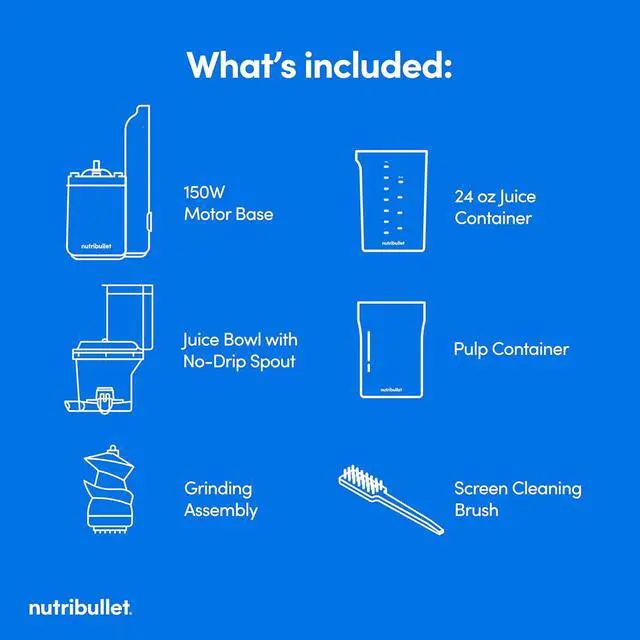 The NutriBullet Slow Juicer comes with (1) 150W motor base, (1) juice bowl with no-drip spout, (1) grinding assembly (1) 24-oz juice container (1) pulp container, (1) screen-cleaning brush, and (1) User & Recipe Guide