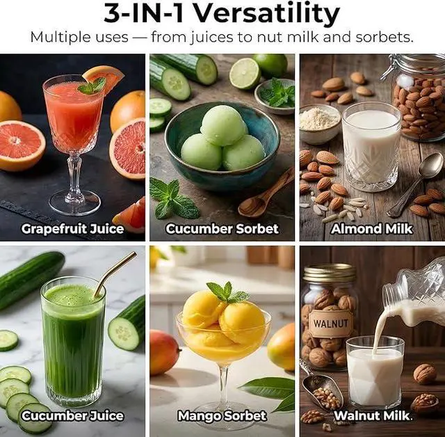 2. [95% High Juice Yield & Nutrients] Maximize every drop! Our cold press juicer technology mimics hand-squeezing to deliver up to 95% yield with bone-dry pulp. Extract vital enzymes with minimal heat and oxidation.