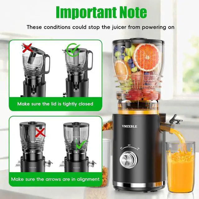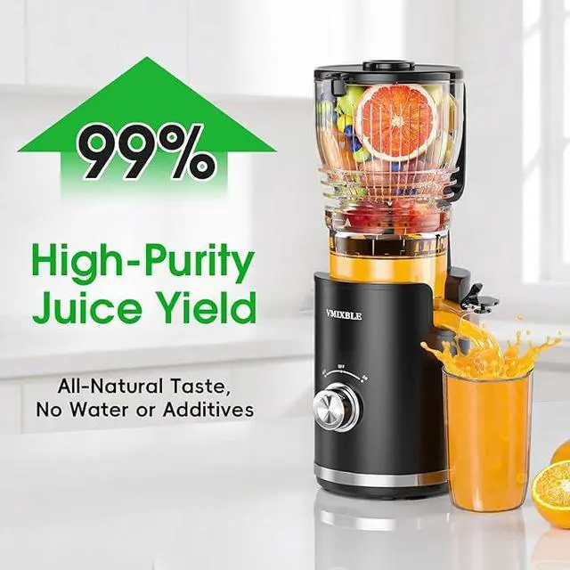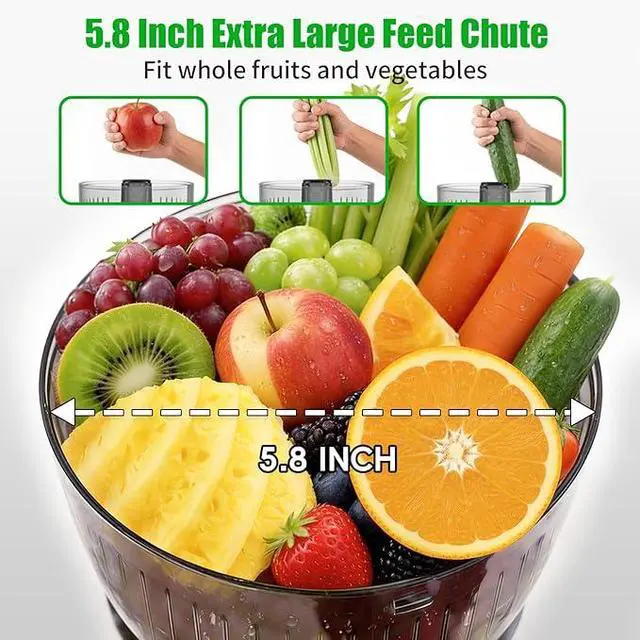 5.8 Inch Wide Feed Chute for Whole Fruits & Vegetables: The slow juicer machine juices whole oranges, carrots, and leafy greens like kale without pre-cutting. The safety lock automatically stops the juicer if the lid is opened, ensuring family safety.
