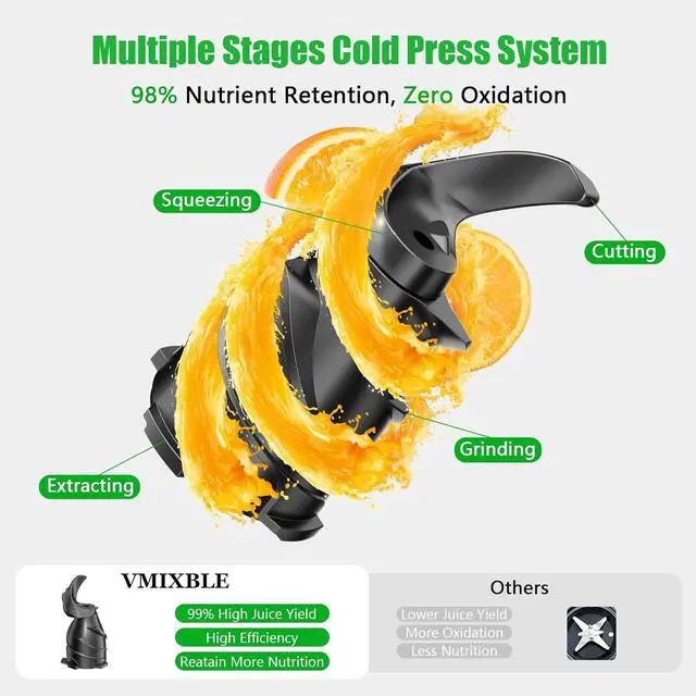 High Juice Yield: A torque-packed auger in the cold press juicer crushes fruits at slow RPMs, extracting up to 99% juice yield while protecting vitamins.