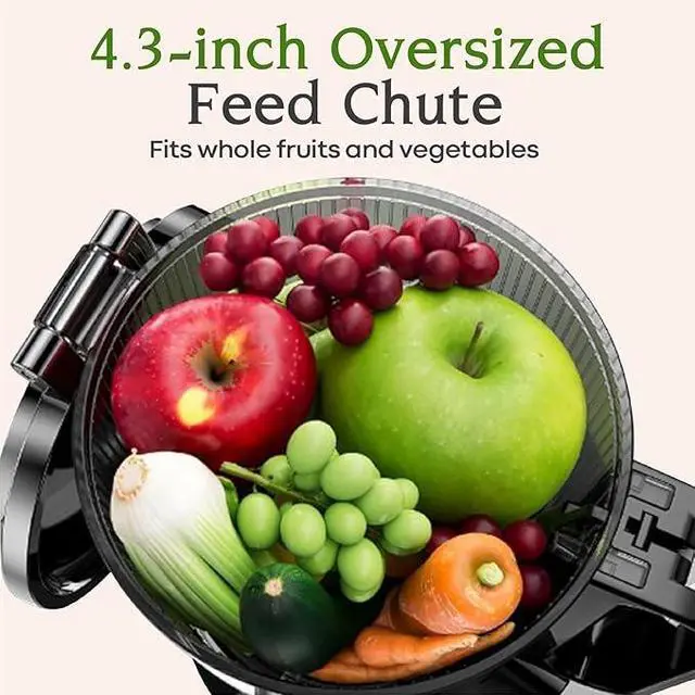 4.3-inch Big Mouth Feed Chute This Anybear juicer machine has oversized 4.3" feed chute, fits larger fruits, vegetables and larger quantities of produce. You can directly add to the machine, no need to cut, saving your time and increasing juice efficiency.